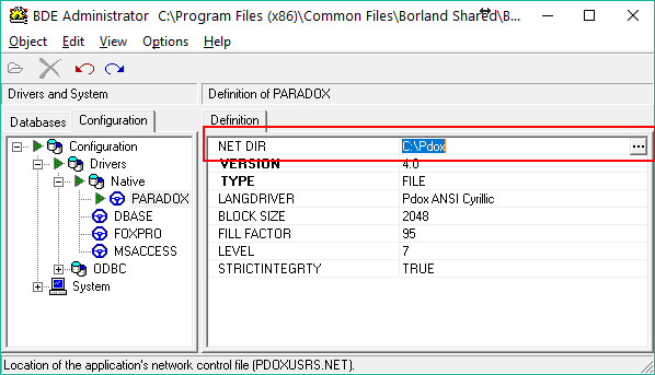 - В закладке Configuration в разделе Configuration\Drivers\Native\Paradox изменим параметр NET DIR с C:\ (по-умолчанию) на C:\PDOX и зафиксируем изменения кнопкой Apply.