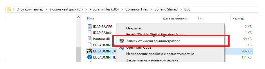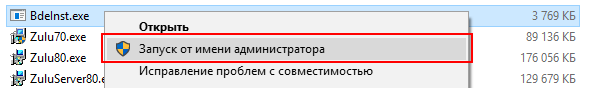 Скачать BDE - Запустить установочный файл BdeInst.exe с правами администратора. Для этого достаточно щелкнуть по файлу правой кнопкой мыши и выбрать пункт Запуск от имени администратора.