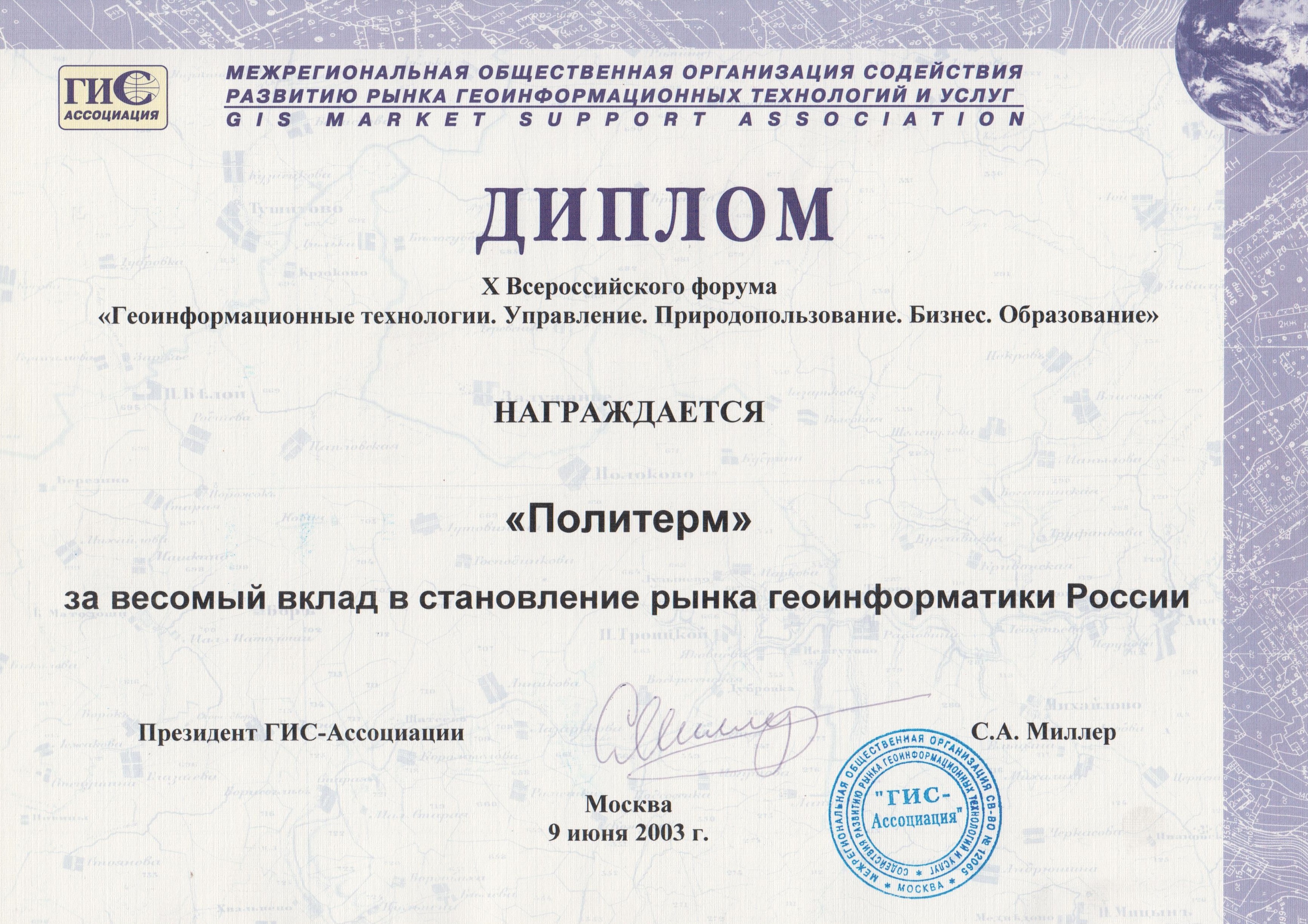 ГИС-Ассоциация отметила весомый вклад компании «Политерм» в становлении рынка Геоинформационных систем России.