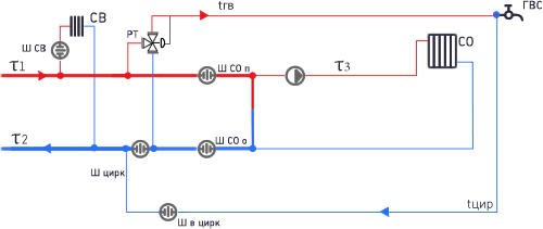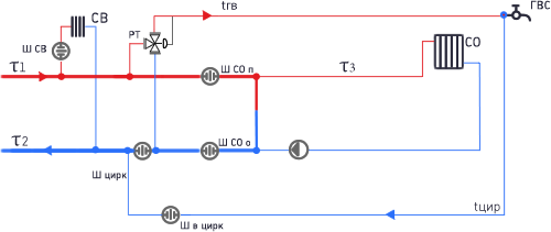 - Схемы 36-43. Для этих схем предусматривается установка перемычки, по которой будет происходить подмешивание теплоносителя из обратного трубопровода, и установка местного циркуляционного насоса. Насос устанавливается либо на подающей, либо на обратной линии. Схемы реализованы с различным способом подключения нагрузки на ГВС.