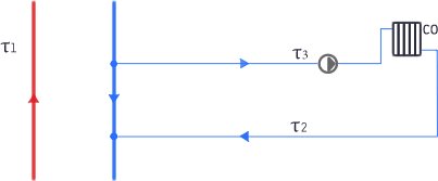 - Схема 44. Подключение потребителя к обратному трубопроводу. Поверхность нагрева системы отопления здания в данном случае должна быть определена не исходя из общепринятых 95°С, а по температуре в обратном трубопроводе 70°С. Циркуляционный насос должен компенсировать потери в системе отопления при расчетном расходе.