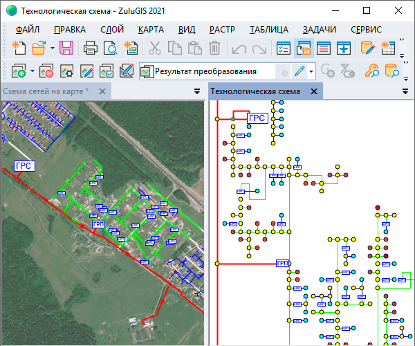 Модуль позволяет генерировать технологические схемы на основе существующего слоя газовой сети, формируя эквивалентную гидравлическую модель с учетом принципов ортогональности.Технологическая схема отображается без привязки к местности, но сохраняет топологию сети для решения расчётных и аналитических задач, в том числе и гидравлических расчетов с применением расчетного модуля ZuluGaz.