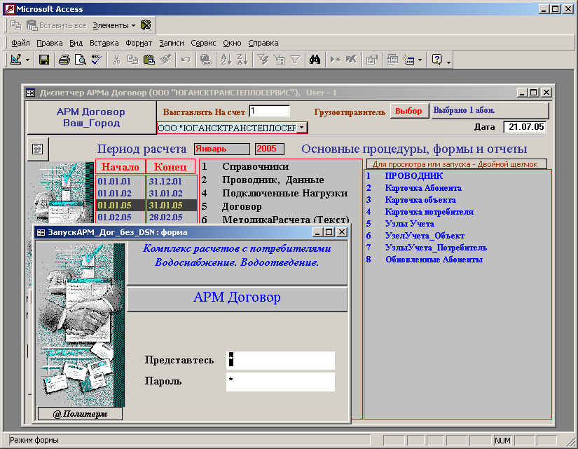 АРМ «Договор» активно используется на первом этапе внедрения подсистемы, для занесения исходной информации, в дальнейшем - периодически для ввода новых договоров. Работа с АРМом заканчивается формированием текстов и приложений к договорам. При этом активно используется интеграция с MS Office, например, текст договора формируются в документе MS Word. Предусмотрены возможности прогнозирования отпуска воды и оплаты по месяцам, кварталам, году, с разбивкой по потребителям и тарифам.