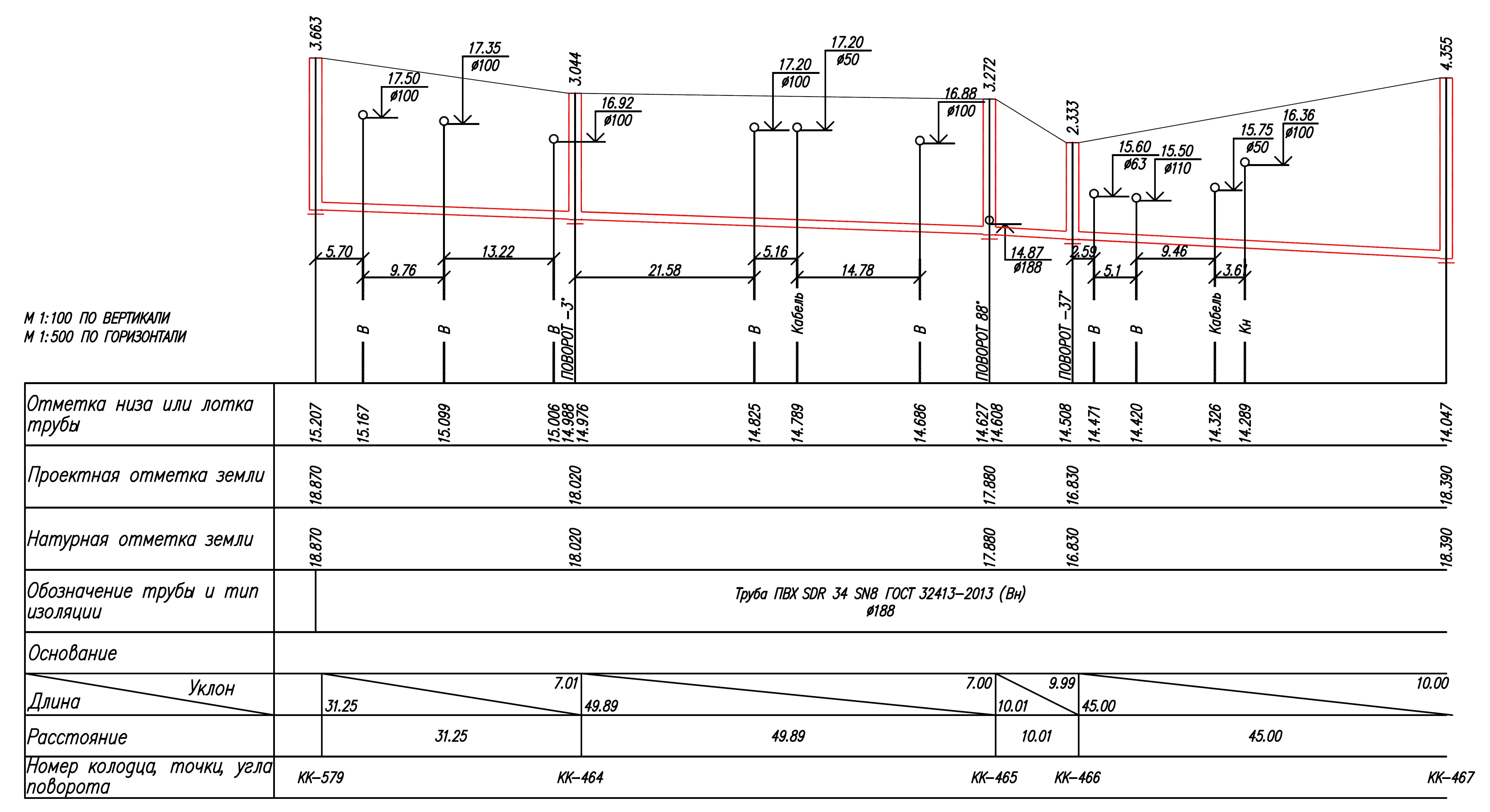 Продольный профиль канализационной сети экспортируется в формат Autocad - DXF. Таблица профиля заполняется автоматически: на основании информации из базы данных и отображения на карте. Внешний вид профиля: вертикальный и горизонтальные масштабы, формат листа, ширина колодцев, вес линий и высота текста настраиваются пользователем.