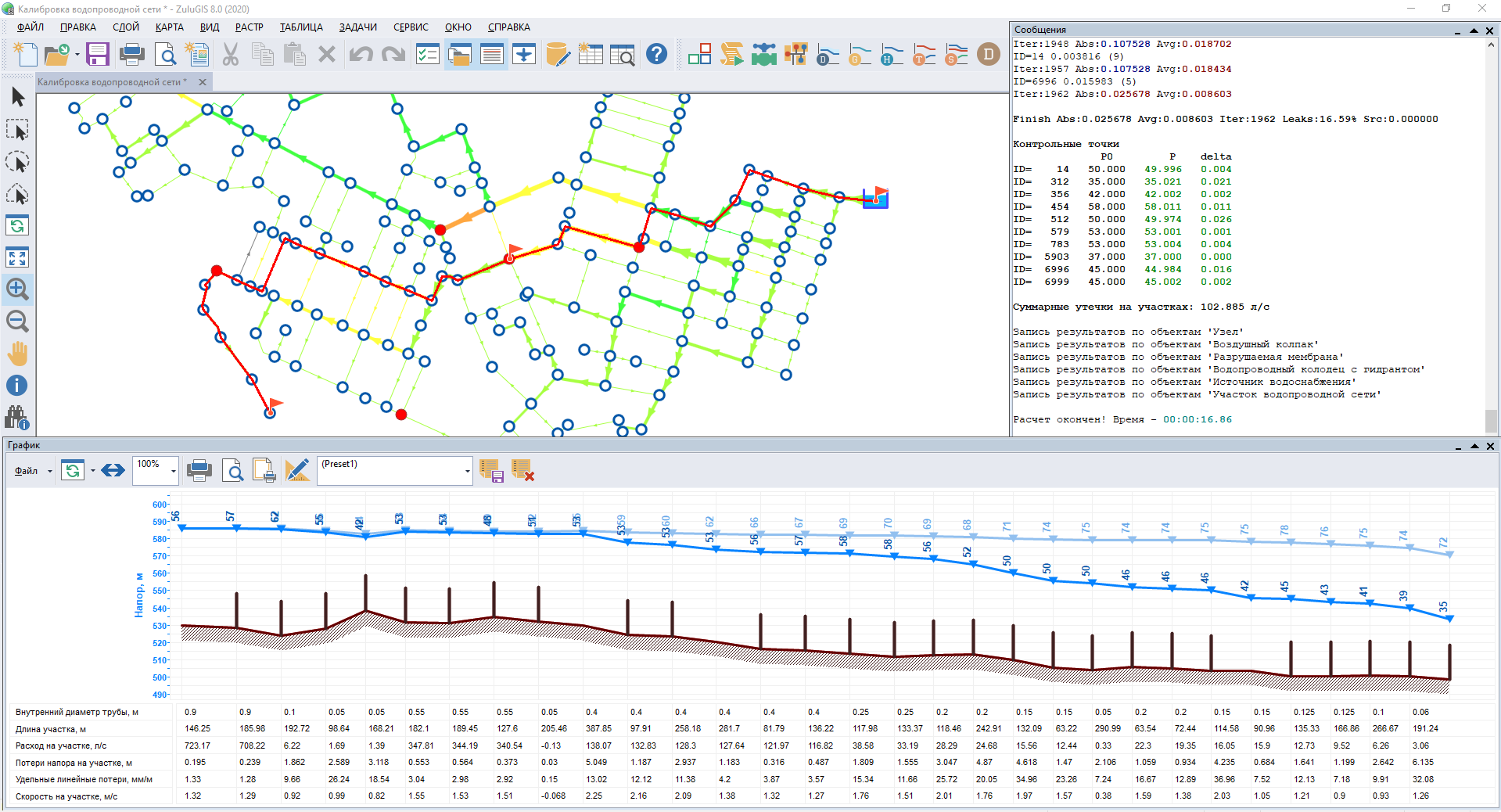 В результате расчета подбираются новые гидравлические сопротивления и коэффициенты утечек для участков сети так, чтобы математическая модель давала минимальные отклонения от давлений в контрольных точках, распределяла суммарные утечки по участкам сети, и обеспечивала баланс расходов между источниками.