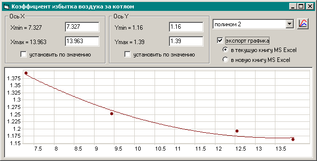 Программными средствами задачи обеспечивается дополнительный сервис, предусматривающий прогнозирование значений параметров работы котла на промежуточных режимах, построение динамических графиков изменения исследуемых показателей и экспорт результатов в базу данных ПРК Источник. |