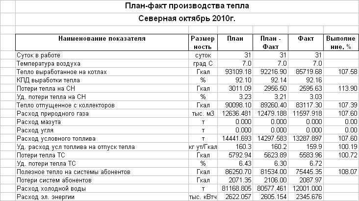 | Исходными данными для вычисления показателей по категории план-факт являются фактические условия работы, имевшие место в течение истекшего периода, в том числе: фактические климатические данные, продолжительность и режимы работы объектов, теплота сгорания топлива и другие условия. Расчет показателей по категории план-факт выполняется, как планирование в указанных фактических условиях отработанного периода. Источником фатических данных за тработанный период являются суточные ведомости котельных. |