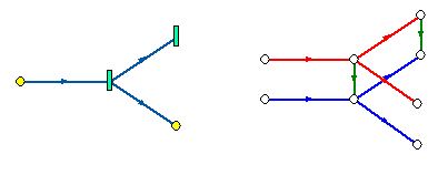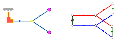 Вот пример простой сети из одного источника, тепловой камеры и двух потребителей во внешнем и внутреннем представлениях: