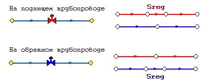 Дросселирующие устройства (регуляторы давления, располагаемого напора, расхода и нагрузки) в однолинейном представлении являются узлами, но во внутренней кодировке - это дополнительные участки с постоянным или переменным сопротивлением. В дросселирующий узел обязательно должен входить только один участок, и только один участок из узла должен выходить.