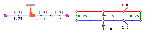 На рисунке изображены две одинаковые схемы. В первой участок вводился слева направо, во второй - справа налево. На участках подписаны полученные при расчете расходы по подающим и обратным трубопроводам. Соответствующие значения расходов на обоих схемах отличаются только знаком, так как отличаются направления ввода участков, но и в первом и во втором случаях вода течет от источника к потребителю по подающему трубопроводу и от потребителя к источнику по обратному.