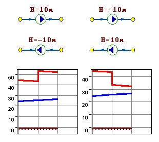 На рисунке видно, как различные направления участков, входящих и выходящих из насоса в сочетании с разными знаками напора на насосе влияют на результат расчета, отображенный на пьезометрических графиках. Когда задается только значение напора на насосе, оно остается неизменным не зависимо от проходящего через насос расхода.