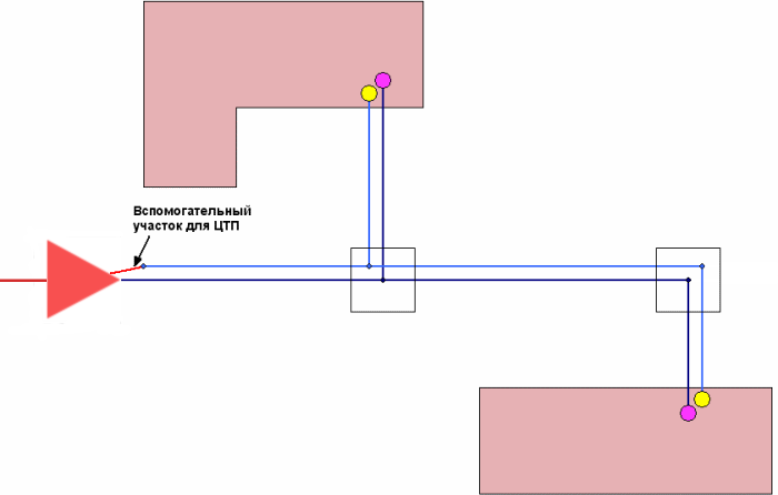 ЦТП - это узел дополнительного регулирования и распределения тепловой энергии. Наличие такого узла подразумевает, что за ним находится тупиковая сеть, с индивидуальными потребителями. В ЦТП может входить только один участок, а выходить один участок по контуру с отопительной и вентиляционной нагрузкой и только один вспомогательный участок для задания нагрузки ГВС. Причем входящий участок идет со стороны магистрали, а выходящие участки ведут к конечным потребителям. Таким образом, после ЦТП может наблюдаться двух и четырех трубная сеть.