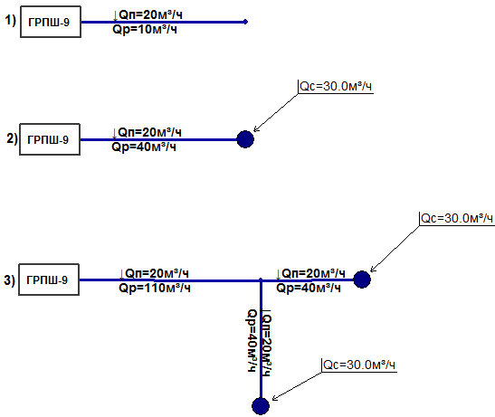 Если в конце участка установлен потребитель с сосредоточенным расходом то расход газа на нем определяется как сумма половины от Путевого расхода и сосредоточенного расхода: