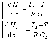 В этом случае возможно появление фазовых переходов, а для двухфазной среды в качестве динамической переменной (в каждом контуре) естественно выбрать энтальпию H1 и H2 (удельное теплосодержание). Последняя при заданном давлении позволяет вычислить и температуру и степень сухости пара. Поэтому дифференциальные уравнения примут вид: