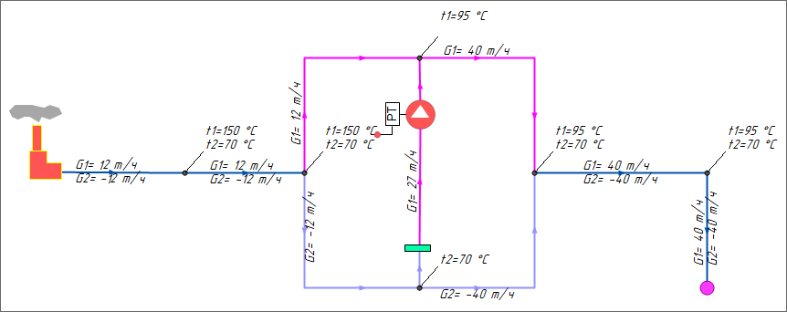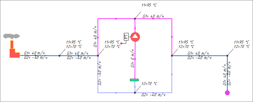 В этом случае расход по перемычке будет равен 0, так как регулятор будет поддерживать заданную для него температуру 95℃ (как в и других случаях, когда текущая температура меньше или равна заданной на регуляторе).